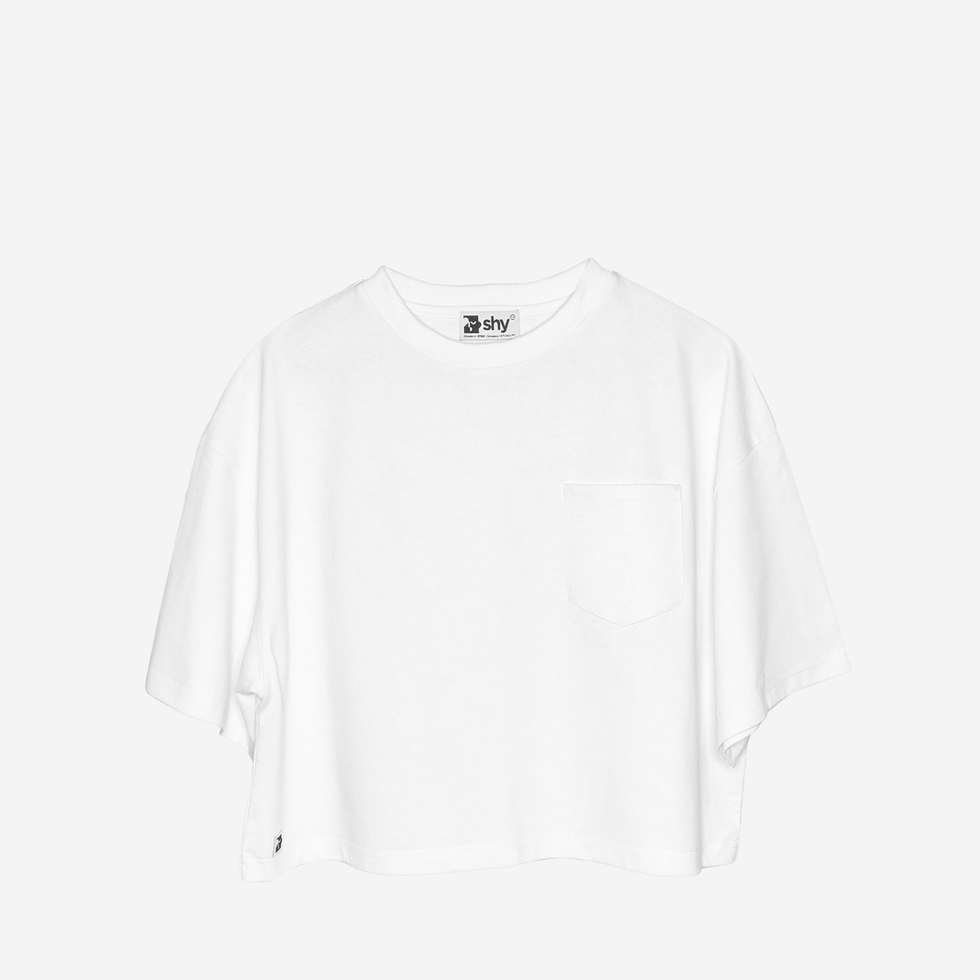 TheShyClub's Oversized Crop Top with Pocket in a crispy bright white, crafted from a blend of 65% cotton and 35% polyester that ensures comfort.